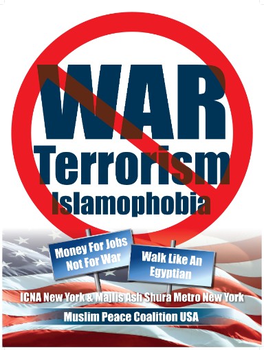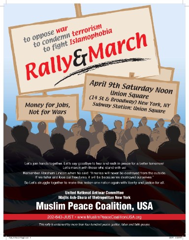 United National Anti-War Committee along with 500 peace, justice, interfaith, and labor organizations called for April 9 to be the day when New York comes together to stand for "Money for Jobs not for War." The Rally was also endorsed by Muslim Peace Coalition and 100 Imams from New York.
